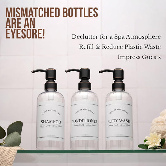 Clear Refillable Shampoo, Conditioner, and Body Wash Bottles - PET Plastic Shampoo Bottles Refillable with Oil Rubbed Bronze Pump - Waterproof Labels - 16 oz, 3 Pack