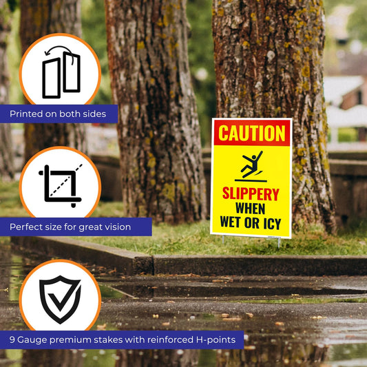 Caution Slippery When Wet or ICY Sign, (SI-84404) Double Sided 9x12 Inches, Corrugated Plastic with Metal H Stake, Made in USA by Sigo Signs