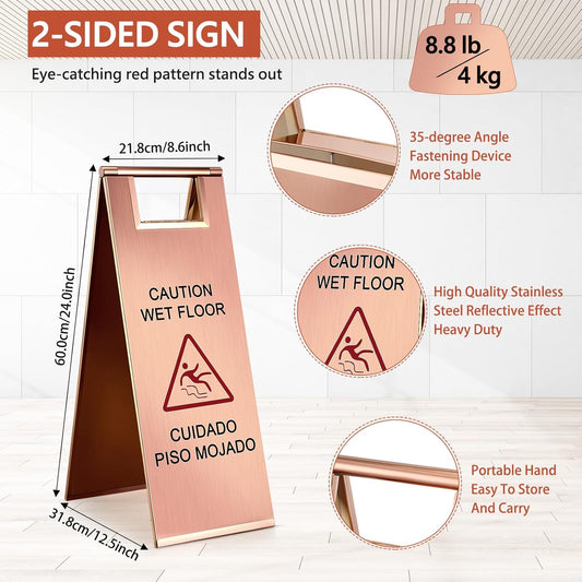 Kigley 2 Pcs Wet Floor Sign, 24 Inch Stainless Steel Caution Wet Floor Sign Double Sided Portable Foldable Bilingual Safety Warning for Hotel Market Restroom Restaurant Office (Rose Gold)