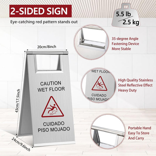 Kigley 2 Pcs Wet Floor Sign, 17 Inch Stainless Steel Caution Wet Floor Sign Double Sided Portable Foldable Bilingual Safety Warning for Hotel Market Restroom Restaurant Office (Silver)