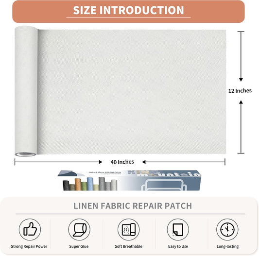 KING MOUNTAIN Fine Linen Repair Patches, Self-Adhesive Linen Fabric Patches, 12X40 inch Extra Size, Multi Color, Can be Used for Linen Sofa Repair and Linen Clothes Repair(12" x 40",White)