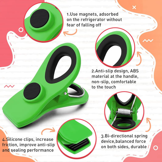 FINDMAG Big Chip Clip, Green Magnetic Wide Bag Clip Set, Cute Magnet Clips Refrigerator Sealing Clip, Plastic Food Clips Great for Kitchen, Home, Snacks, Bread, 12 Pack