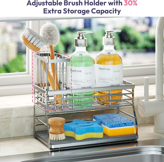 SWTYMIKI Kitchen Sink Caddy Organizer, 2 Tier Sponge Holder for Kitchen Sink with Instant Drying Stone, Removable Brush Holder for Fast Drying on Countertop, Silver