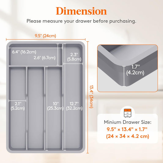 Lifewit Silverware Drawer Organizer Tray, Plastic Cutlery Storage for Kitchen Drawer, Flatware and Utensil Holder Divider for Spoons Forks Knives Tableware, 5 Compartment, Gray