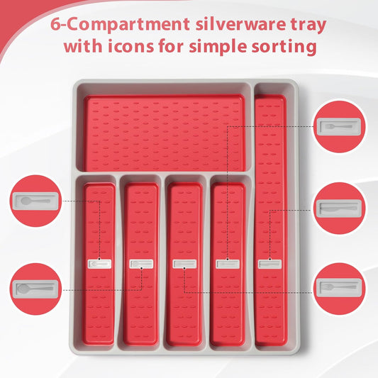 Silverware Organizer with Cutlery Icons,Silverware Tray for Kitchen Drawer,Plastic Flatware Tableware Cultery Drawer Organizer Utensil Organizer with Non-slip TPR Linings,6-Compartment