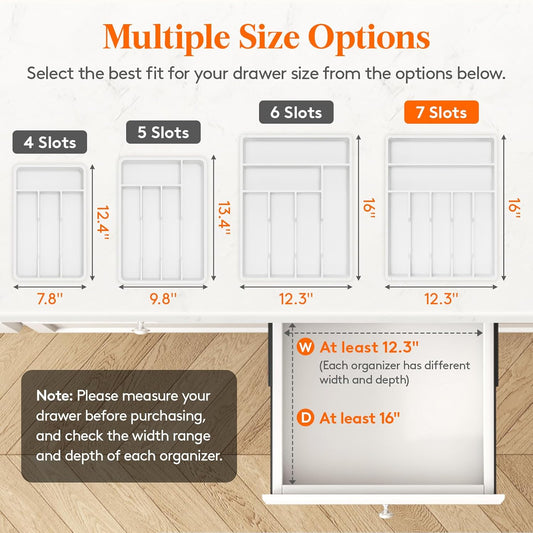 Silverware Organizer - Expandable Kitchen Drawer Organizer, BPA-Free Food-Safe Utensil Drawer Organizer with 7 Compartments, Deep Cutlery Tray for Forks, Knives, White