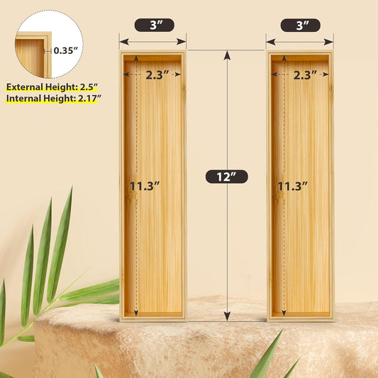 Bamboo Drawer Organizer, Narrow Stackable Cutlery Tray for Kitchen, 2 Pcs Silverware & Utensil Box, 12" x 3" x 2" (Outer), 11.3" x 2.3" x 1.77" (Inner)