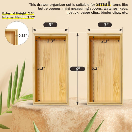 Kitchen Drawer Organizer Bins, Stackable Bamboo Deep Drawer Organizer for Silverware, Utensils, Cutlery, Flatware, Junk Drawer, Dresser, Bathroom, 6" x 3" x 2.5" (Set of 2)