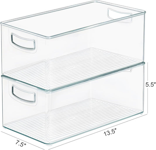 2 Pack Clear Freezer Organizer Bins Stackable Storage Bins with Side Handles for Kitchen Pantry Cabinet Organzation and Storage