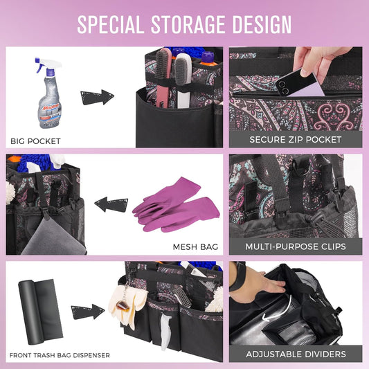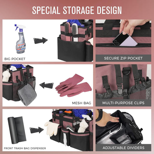 Wearable Cleaning Caddy, Cleaning Caddy Supplies Organizer with Handle & Shoulder Straps for Housekeepers, Under Sink & Car Cleaning Tool Organizers Bag with 4 Foldable Divider (LotusPink)