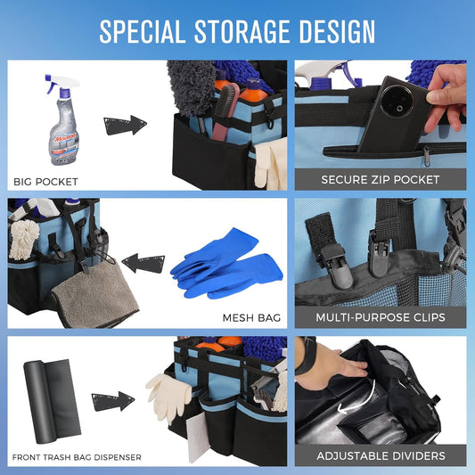 Wearable Cleaning Caddy, Cleaning Caddy Supplies Organizer with Handle & Shoulder Straps for Housekeepers, Under Sink & Car Cleaning Tool Organizers Bag with 4 Foldable Divider (CeruleanBlue)