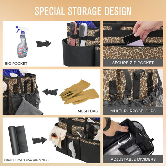 Wearable Cleaning Caddy, Cleaning Caddy Supplies Organizer with Handle & Shoulder Straps for Housekeepers, Under Sink & Car Cleaning Tool Organizers Bag with 4 Foldable Divider (Leopard)