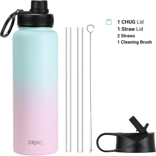 DRINCO Stainless Steel Water Bottle Spout Lid Vacuum Insulated Double Wall Water Bottle Wide Mouth (40oz 32oz 22oz 18oz 14oz) Leak Proof Keeps Cold or Hot (40 oz, 40oz Macaron)