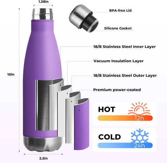 MEWAY 17oz Sport Water Bottle 8 Pack Vacuum Insulated Stainless Steel Leak-Proof Double Wall Cola Shape Water Bottle,Keep Drinks Hot & Cold (Purple,8 Pack)
