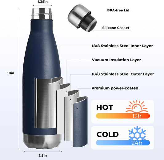 MEWAY 17oz Sport Water Bottle 12 Pack Vacuum Insulated Stainless Steel Leak-Proof Double Wall Cola Shape Water Bottle,Keep Drinks Hot & Cold (Navy,12 Pack)