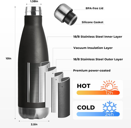 MEWAY 17oz Sport Water Bottle 4 Pack Vacuum Insulated Stainless Steel Leak-Proof Double Wall Cola Shape Water Bottle,Keep Drinks Hot & Cold (Black,4 Pack)