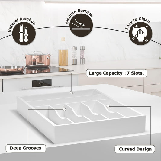 Utensil Organizer Silverware Drawer Organizer - 7 Slots Bamboo Cutlery Organizer Multi-Purpose Silverware Divider for Kitchen Flatware, Hair Accessories, Repair Tools, Art Set W13”x L17” (White)