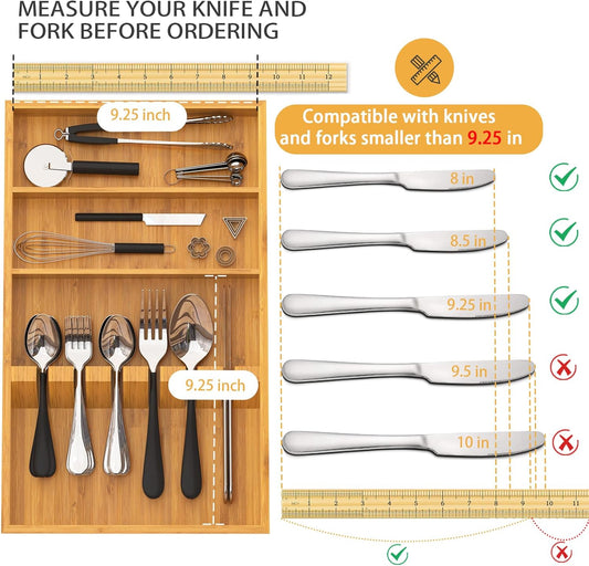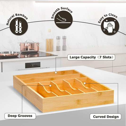 Flatware Organizer Silverware Drawer Organizer - 7 Slots Bamboo Cutlery Tray Multipurpose kitchen Drawer Organizer for Silverware, Utensils, Cutlery, Flatware, Knives W13”x L17” (Yellow)