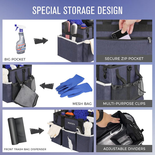 Wearable Caddy Bag, Cleaning Supplies Organizer With Handle & Shoulder Straps for Housekeepers, Under Sink & Car Tool Organizers With 4 Foldable Divider (NavyBlue)