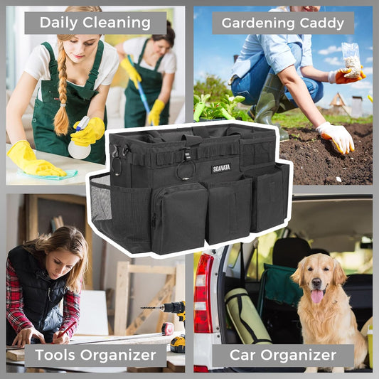 Wearable Cleaning Caddy Bag, Supplies Organizer with Handle & Shoulder Straps for Housekeepers, Under Sink & Car Cleaning Tool Organizer with 4 Foldable Dividers (Black)
