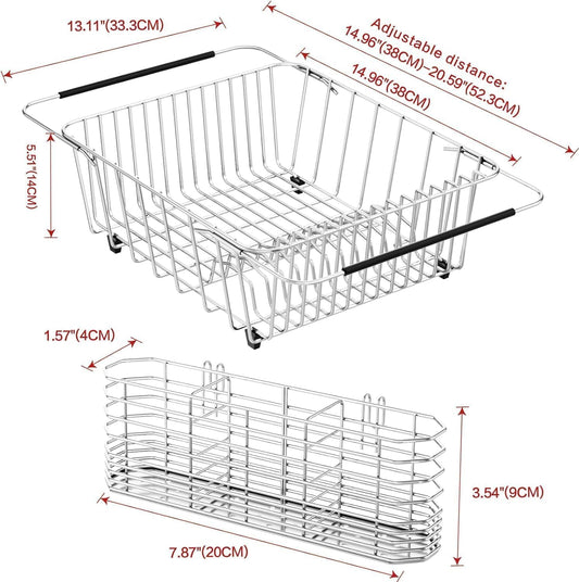 SANNO Expandable Dish Drying Rack,Dish Drainer,Dish Plate Holder Basket in Sink or On Counter with Utensil Silverware Storage Holder, Over The Sink,Rustproof Stainless Steel
