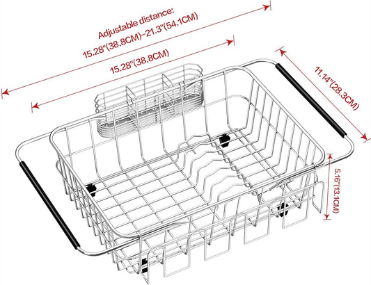 Dish Drainer Rack in Sink Adjustable, Expandable 304 Stainless Steel Metal Dish Drying Rack Organizer with Stainless Steel Utensil Holder Over Inside Sink Counter, Rustproof