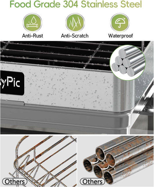 Dish Racks, Thicker Premium 304 Stainless Steel Dish Drying Rack for Kitchen Counter, Automatic Drainage Spout, Dish Drainer & Drainboard Set with Utensil Holder and Cup Holder, Grey