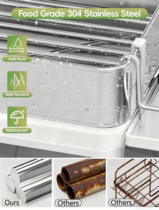 Dish Drying Rack 304 Stainless Steel Dish Racks,Adjustable Spout Auto-Draining Dish Drainers for Kitchen Counter, Large Capacity Dish Rack for Bowls, Cups, White