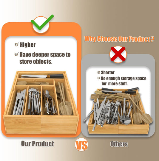 Premium Bamboo Expandable Drawer Organizer, 7-9 Slots Adjustable Kitchen Drawer Organizer for Large Cooking Utensils Cutlery, Kitchen Drawer Organization