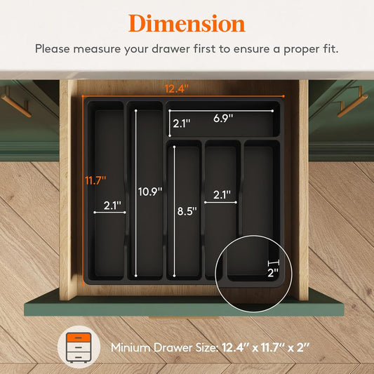 Lifewit Silverware Drawer Organizer Tray, Plastic Cutlery Storage for Kitchen Drawer, Flatware and Utensil Holder Divider for Spoons Forks Knives Tableware, 6 Compartment, Black