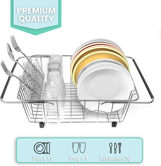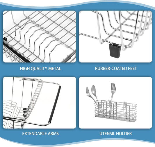 Large Dish Drainer Rack in Sink Adjustable, Expandable 304 Stainless Steel Metal Dish Drying Rack Organizer with Stainless Steel Utensil Holder Over Inside Sink Counter, Rustproof