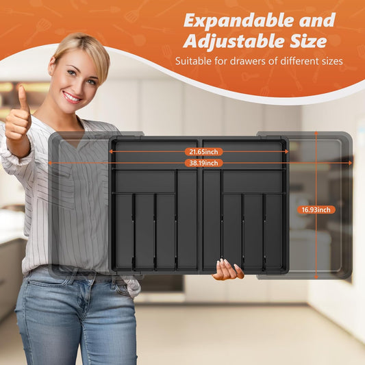 Large Silverware Drawer Organizer,utensil drawer organizer Adjustable Flatware and Cutlery Holder BPA Free Plastic Utensil Tray for Kitchen Spoons Forks Knives Black 21.6 to 38 Inches
