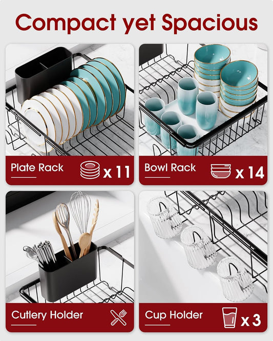 Dish Drying Rack in Sink Expandable Stainless Steel Kitchen Dish Drainer with 4 Cup Holders, Black
