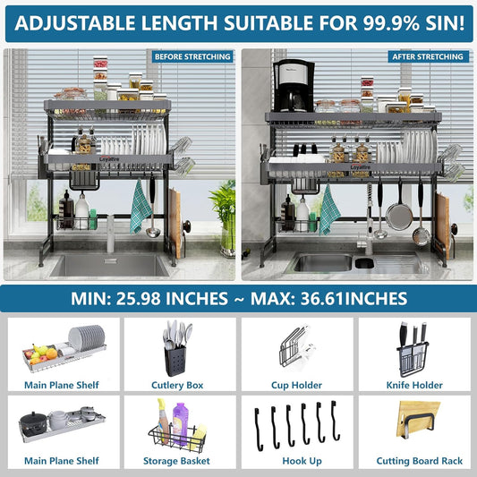 Over Sink Dish Drying Rack, 3 Tier Adjustable Length (20.87'' to 37.6'') Stainless Steel Large Storage Kitchen Dish Rack, Expandable Drainer Shelf Rack with Multifunctional Organizers