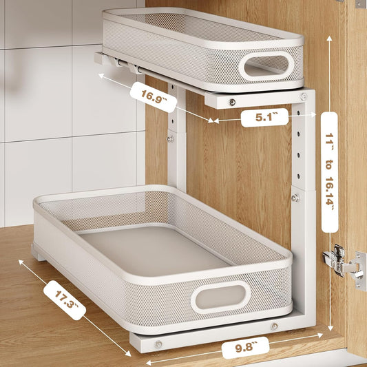 1 Pack 17IN Depth Under Sink Storage Organizer, Large 2-Tier Elegant Mesh Pull Out Shelf for Kitchen and Bathroom Cabinet Organization, L-Shaped and Adjustable Height Design-White