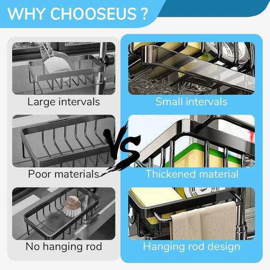 Sink Organizer Rack for Kitchen and Bathroom, 2024 New Kitchen Sink Faucet Organizer with Drip Tray Faucet Sponge Holder (Black, Right)
