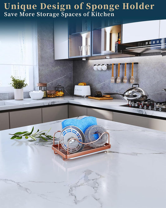 Consumest Sponge Holder for Kitchen Sink - Movable Sink Caddy for Countertop Organizer, 304 Stainless Steel Sponge Holder with Detachable Drip Tray for Kitchen Accessories, Rose Gold