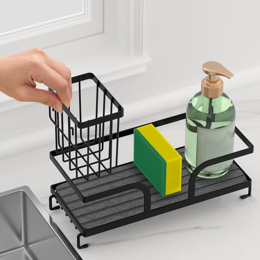 Sponge Holder for Kitchen Sink,Sink Caddy Organizer With Stone Drying Tray, Stainless Steel Kitchen Countertop Organizer for Sponge Soap Dispenser Black