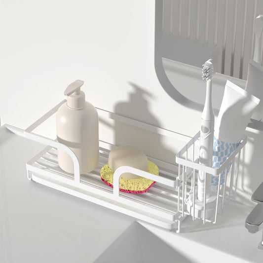 SunnyPoint Never Rust Aluminum Utensil, Sink Cleaning Tools Holder for Kitchen Sink with Drain Board; Dish Wand, Sponge, Soap Dispenser, Utensil Organizer Caddy (WHT)