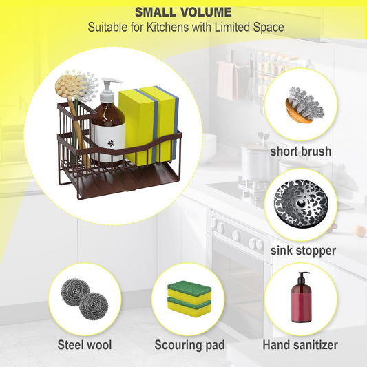 Sponge Holder & Sink Caddy Organizer - Rustproof Kitchen Sink Organizer with High Brush Holder - Kitchen Essentials Countertop Storage Organization (Black)