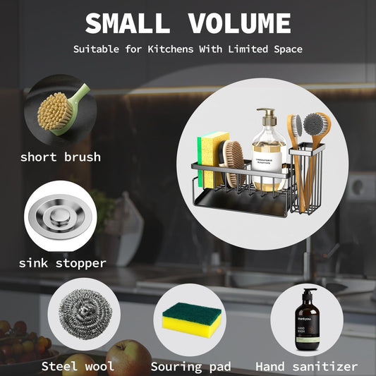 Sponge Holder & Sink Caddy Organizer - Rustproof Kitchen Sink Organizer with High Brush Holder - Kitchen Essentials Countertop Storage Organization (Carbon Black)