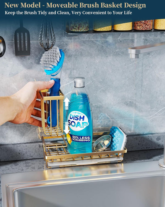 Consumest Sink Caddy, Kitchen Sponge Holder with Dish Brush Holder, Kitchen Sink Organizer with Drip Tray for Countertop, Stainless Steel Rustproof - Gold