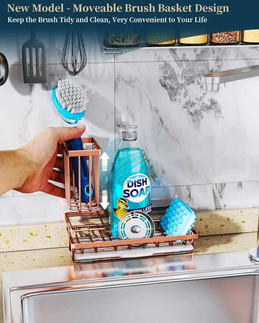 Consumest Sponge Holder for Kitchen Sink - Sink Caddy Kitchen Organizer with Removable Drip Tray for Countertop Dish Soap Dispenser Brush Storage Accessories 304 Stainless Steel, Rose Gold
