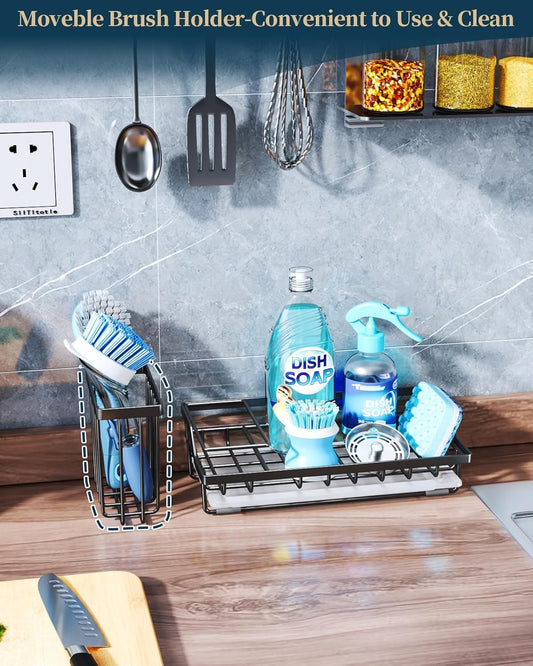 Consumest Sink Caddy, Kitchen Sponge Holder with Dish Brush Holder, Kitchen Sink Organizer with Drip Tray for Countertop Stainless Steel Rustproof, Black-Large