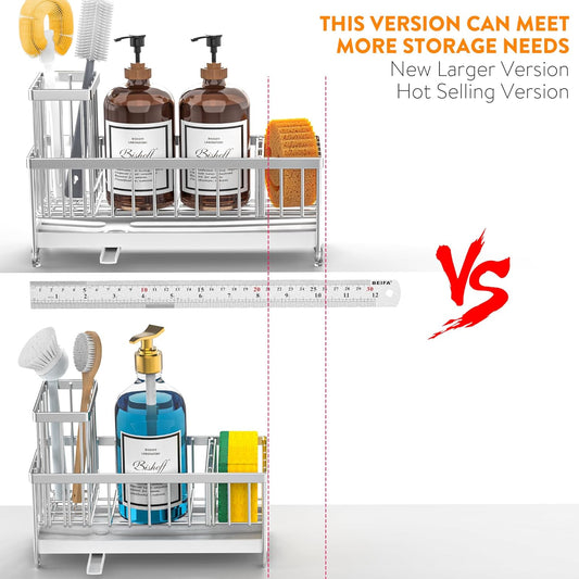 Cisily Cream Sponge Holder for Kitchen Sink, Sink Caddy Organizer with High Brush Holder, Kitchen Countertop Organizers and Storage Essentials, Rustproof 304 Stainless Steel, Soap Dispenser Organize