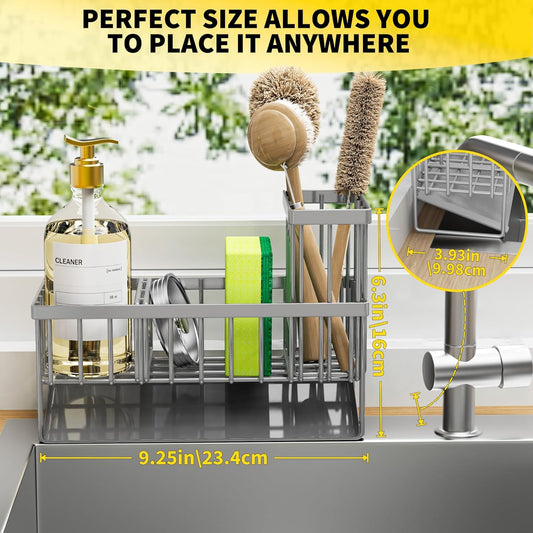 Cisily Sink Caddy Organzier with High Brush Holder, Sponge Holder for Sink, 304 Rustproof Stainless, Kitchen Countertop Soap Dispenser Organizer, Gray Kitchen Decor and Accessories