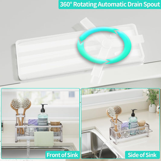 Cisily Sink Caddy Sponge Holder for Kitchen with Brush Holder and Stainless Steel Self Drain Tray, Rustproof Kitchen Sink Organizer for Sponge, Soap Dispenser Storage Accessories (Stainless Steel)
