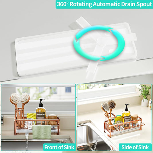 HapiRm Sponge Holder for Kitchen Sink - Self-draining Sink Caddy with Brush and Dishcloth Holders, Stainless Steel Kitchen Organizer for Countertop - Rose Gold