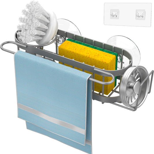 Cisily Grey Kitchen Sink Caddy Sponge Holder in the Sink, Stainless Steel Kitchen Organizer, Brush Holder, Dish Cloth Hanger 2 Installation Ways (Suction & Adhesives