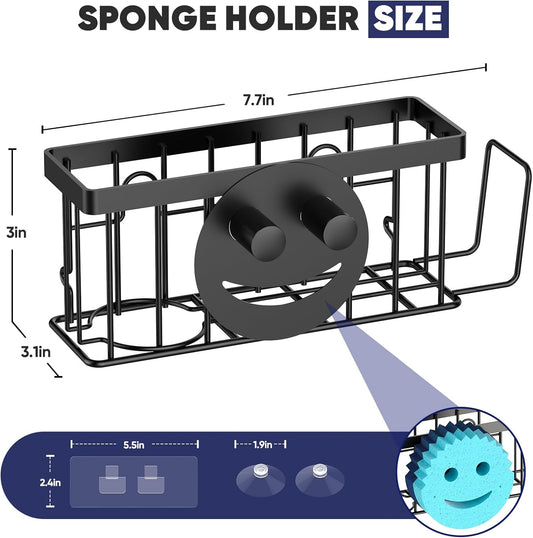 Sponge Holder for Kitchen Sink,Sink Caddy Smiley Face,4-in-1 Sponge Holder with Suction Cups & 1 PCS Adhesive Strips for Holding Soap,Brush,Scrubber,Sponge,Stopper-Black